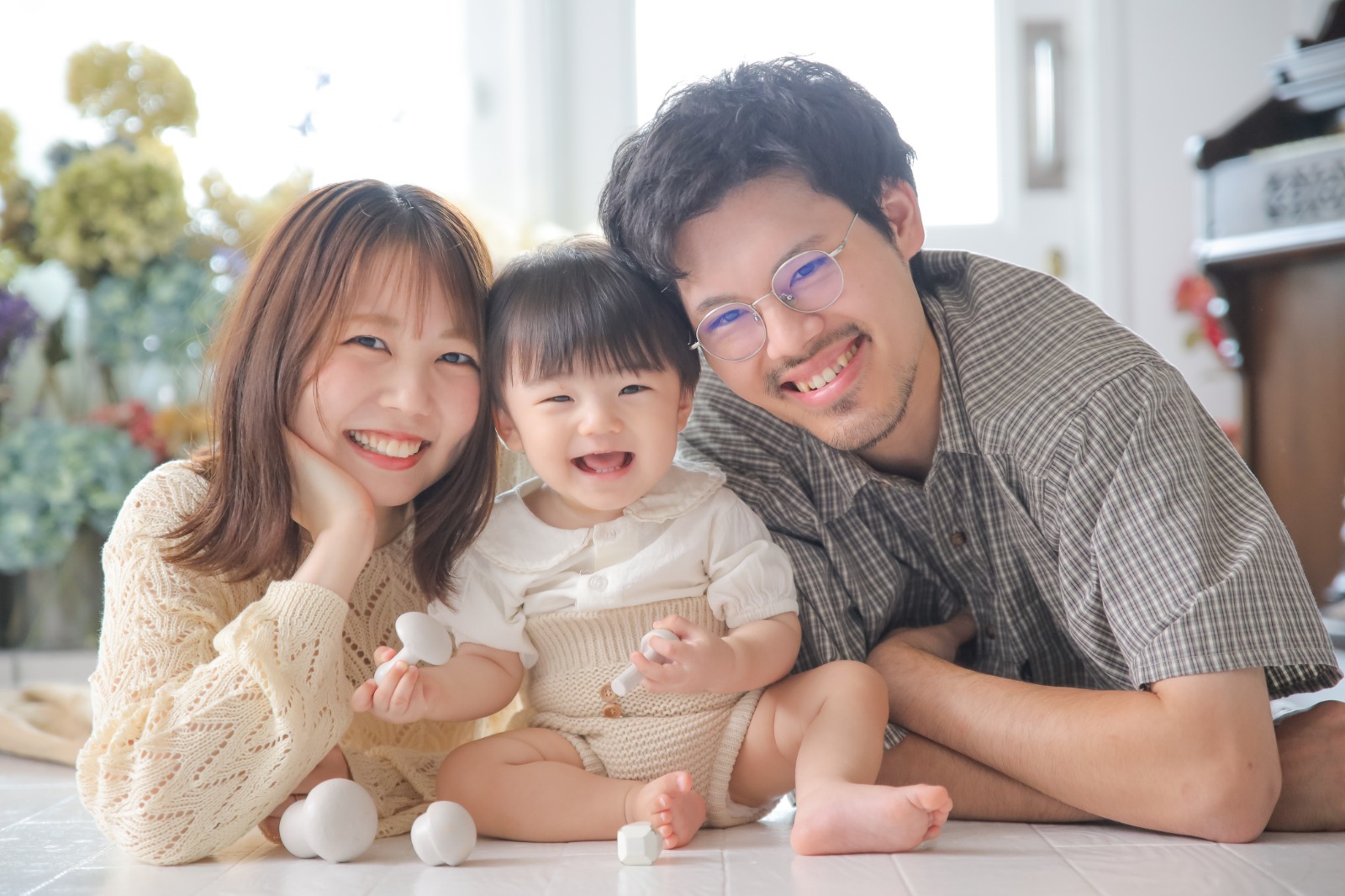お子さまの無邪気な笑顔を中心に、パパとママの柔らかな表情が見事にリンクしています。この「表情の連動」は、撮影者が意識的に間をとり、空気感を整えなければ生まれません。どの瞬間を切り取っても優しさが伝わるように、撮影者が家族の雰囲気を感じ取りながらシャッターを切っていることが伝わってきます。