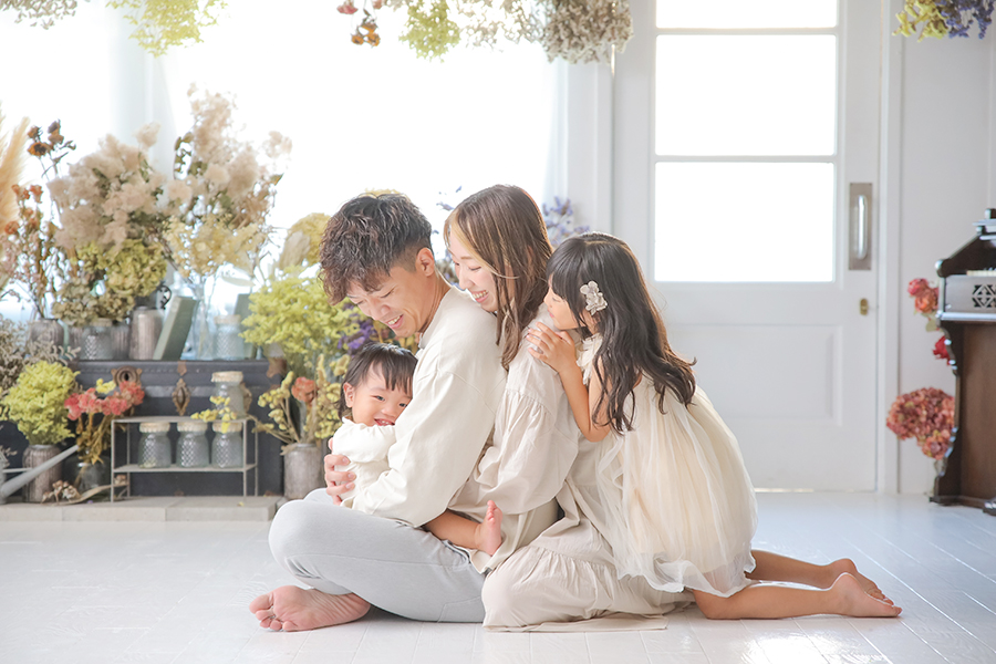 父を中心に、母と姉が自然に寄り添い、最年少の子が中心で安心感を象徴するような構図。
