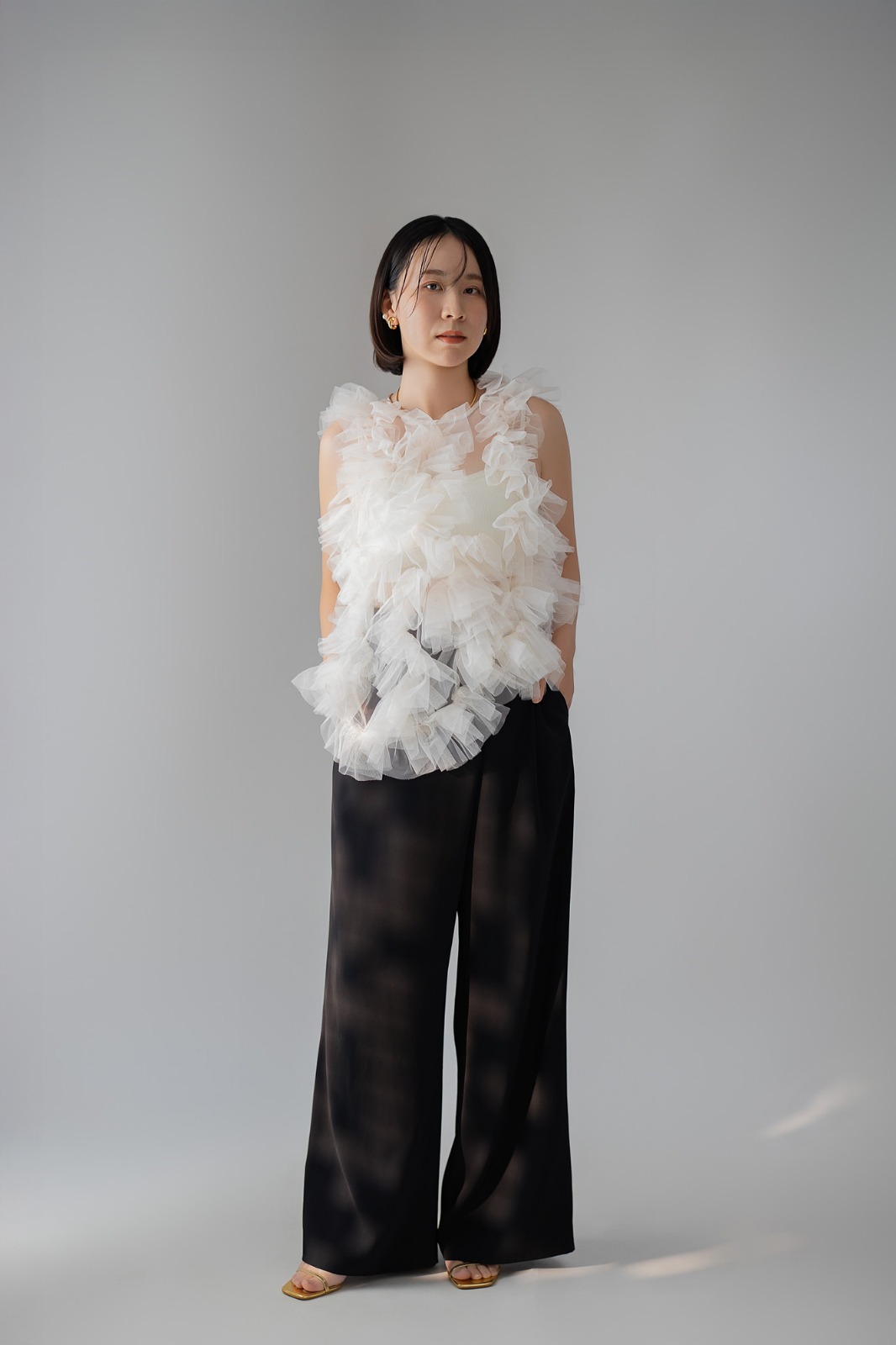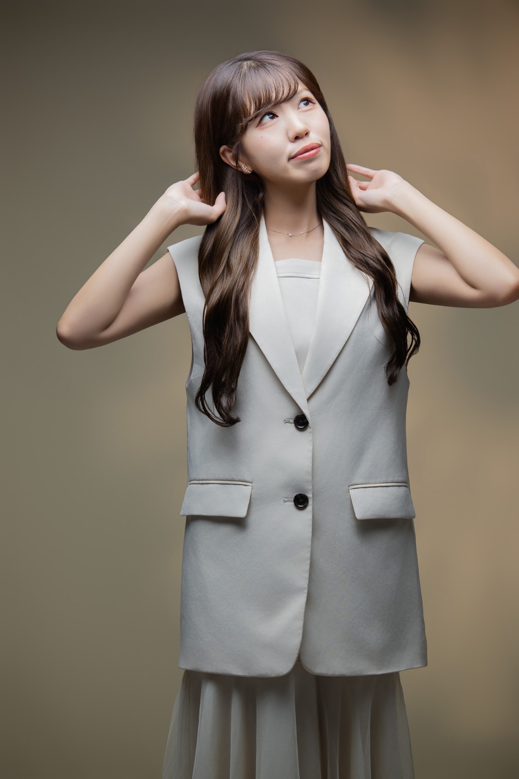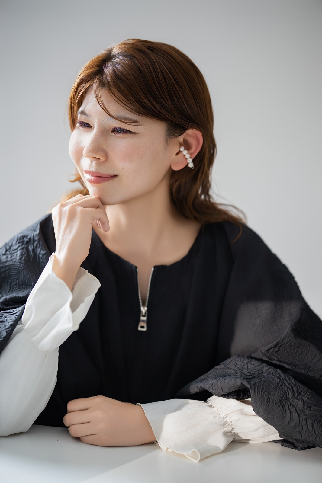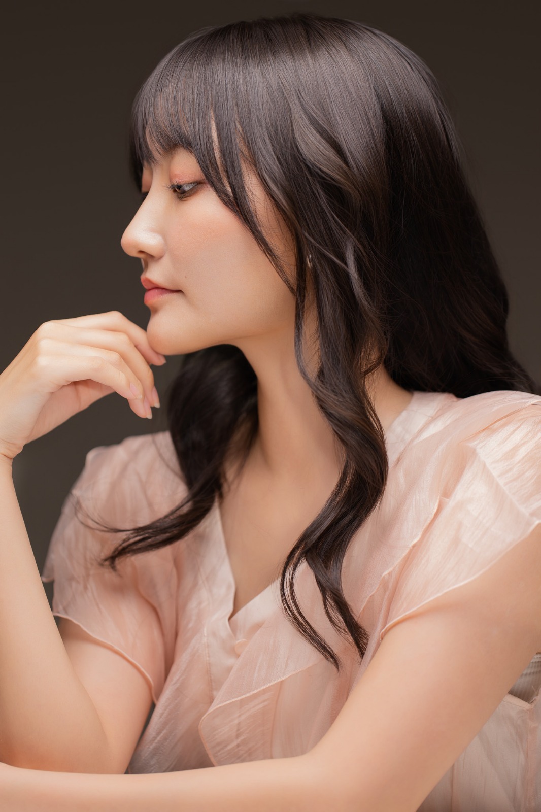 ストレートや軽く巻いた髪が、顔周りをすっきり見せて表情を引き立てます。