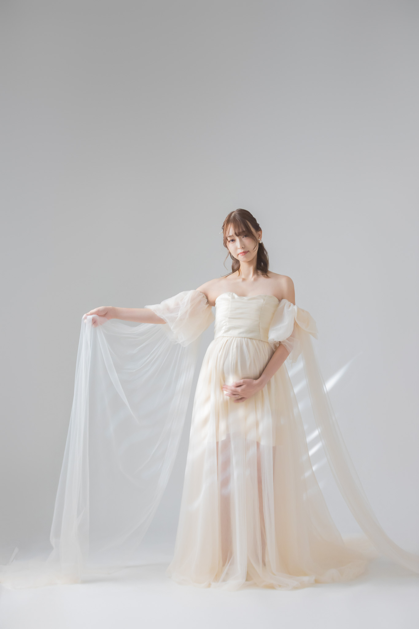 ふんわりとしたチュールの袖が印象的なオフショルダードレスは、軽やかに透ける素材が身体の曲線を自然に包み込み、マタニティならではのやわらかなラインを美しく引き立てます。