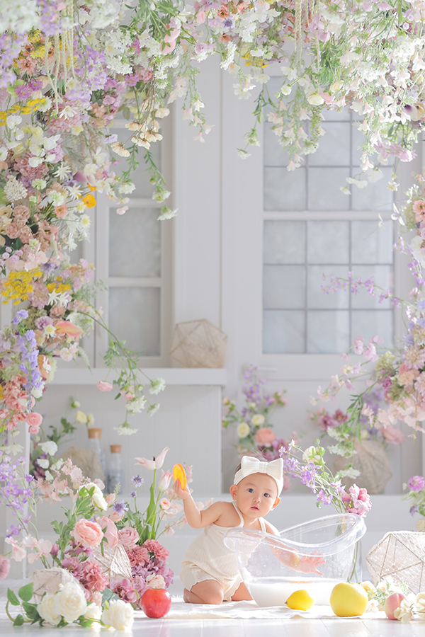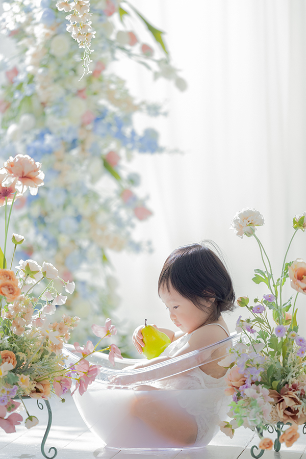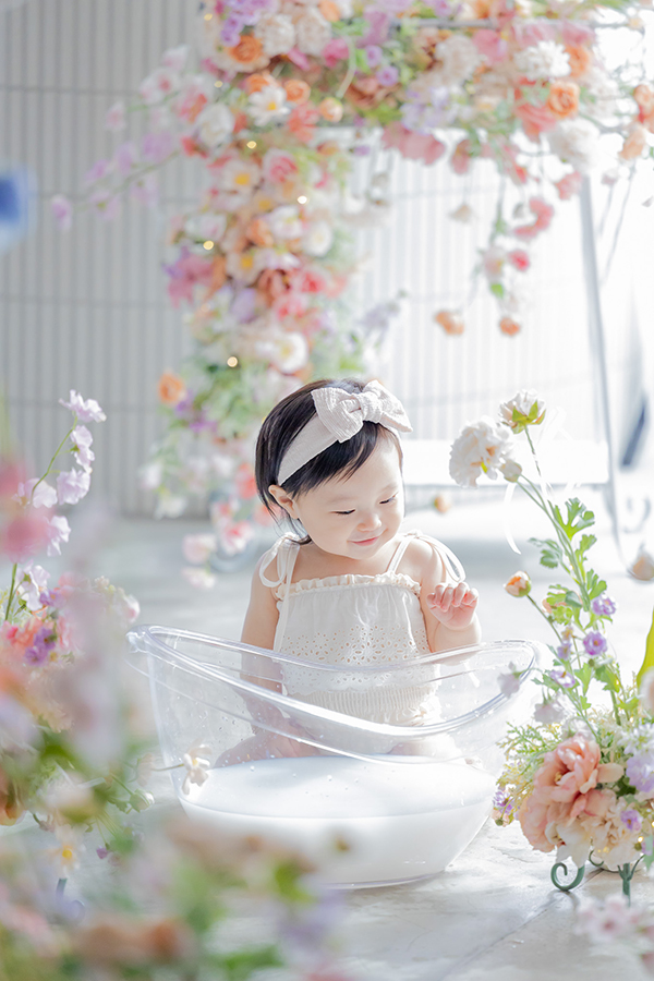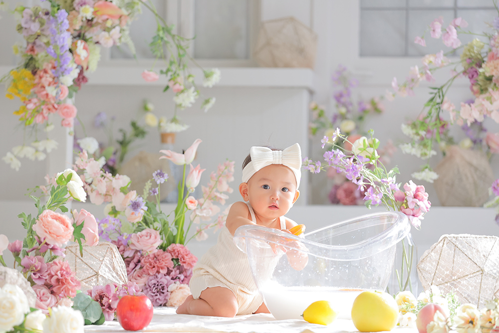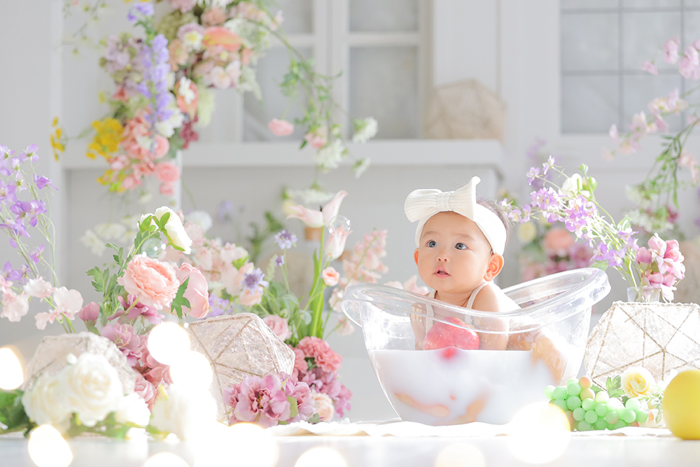 ノーブレムではスタジオ内にミルクバスセットをご用意し、おしゃれなインテリアに囲まれた特別な世界観で撮影できます。